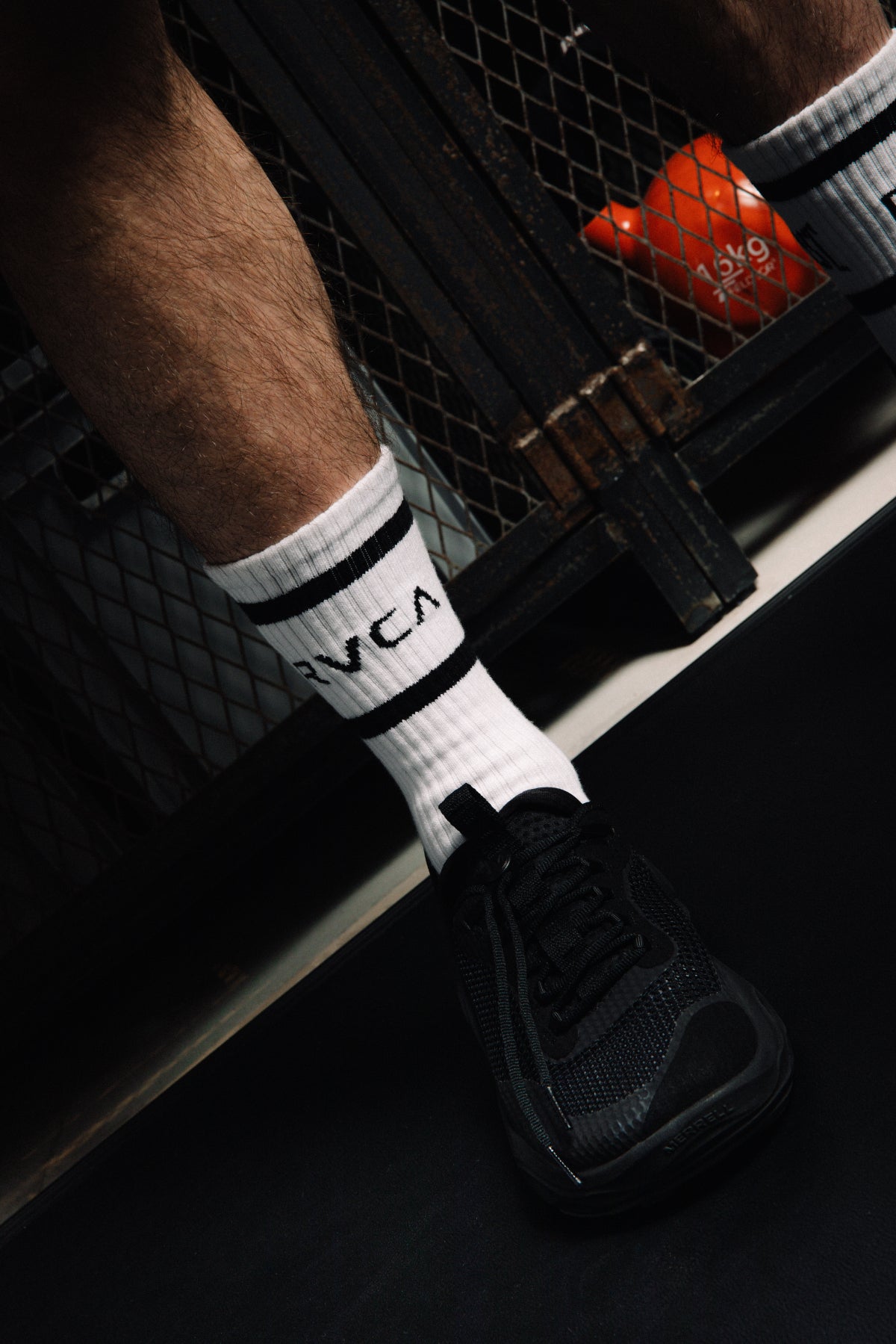 両ブランドのロゴが配されたクールなソックス。トレーニングがアガるグッズです。